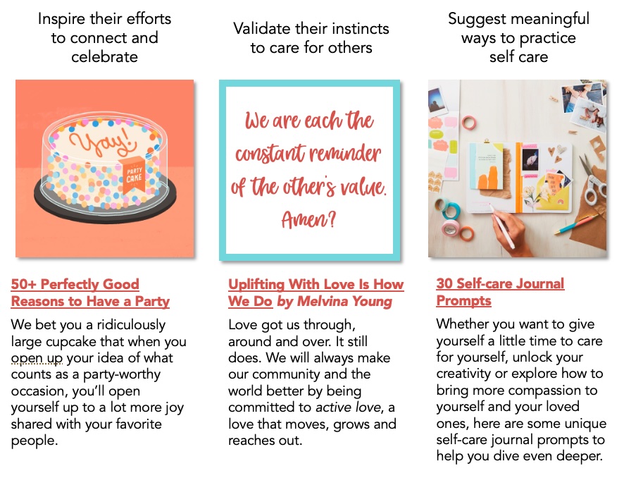 Synthesized answers to “What’s on your mind?” in our consumer community and developed content based on Hallmark brand jobs.