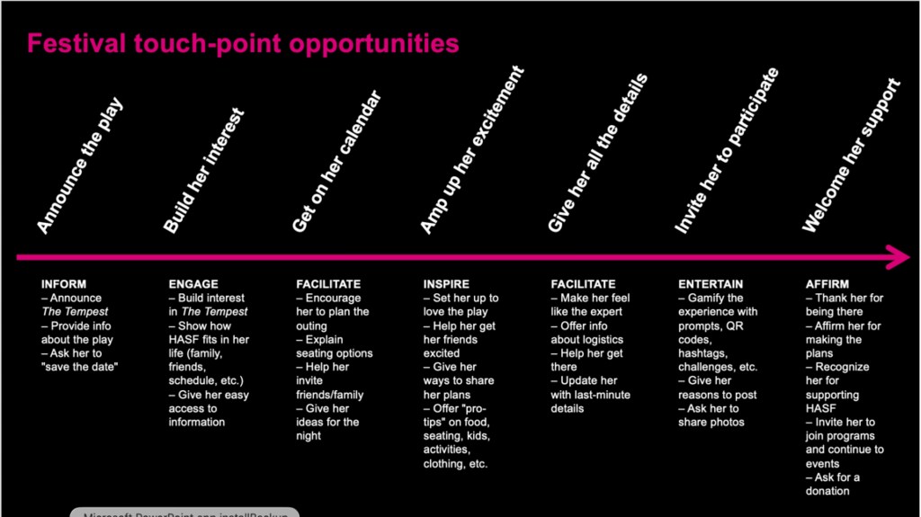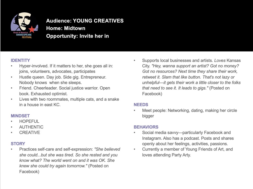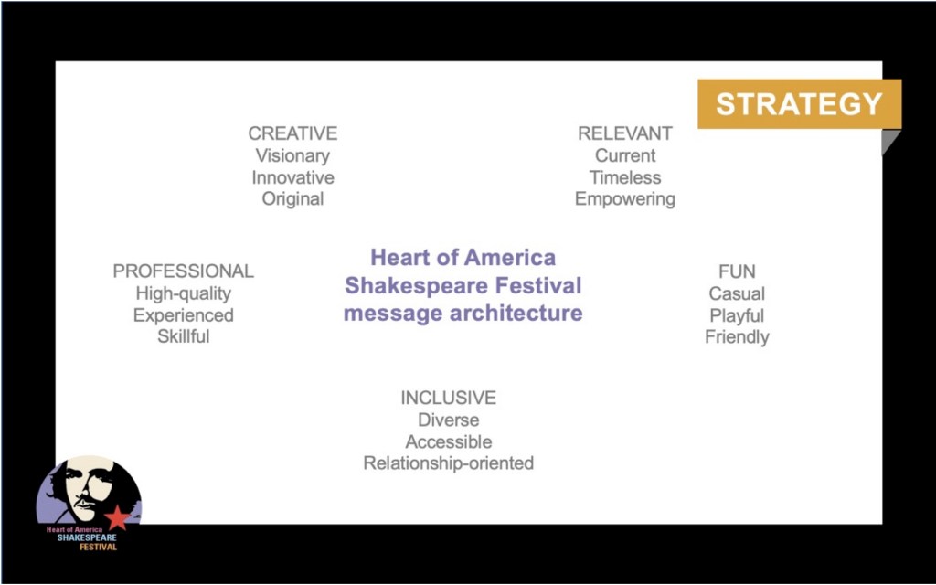FIRST PROJECT: I facilitated a conversation with our social media studio and the KC Shakes team to articulate their message architecture using techniques developed by Margot Bloomstein.
