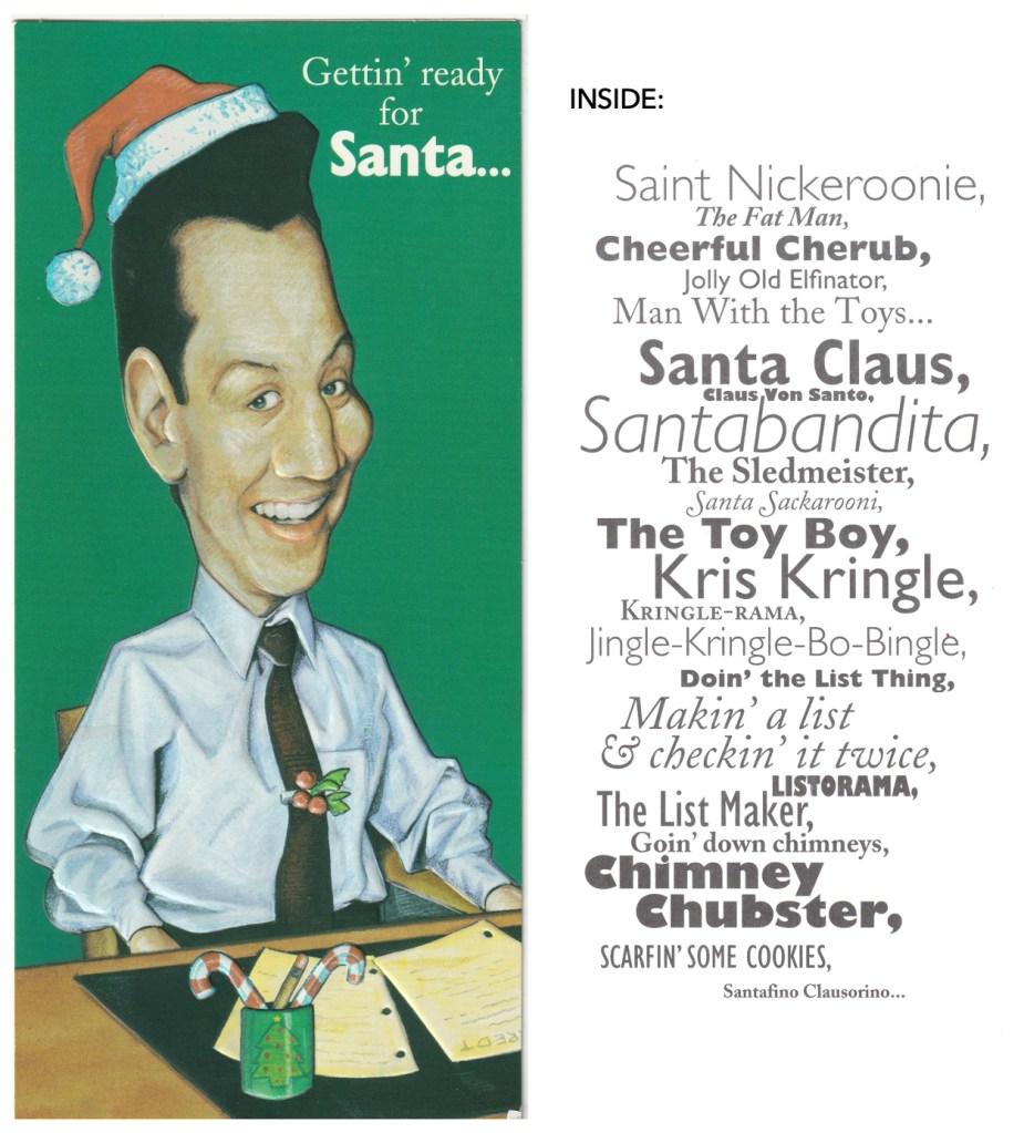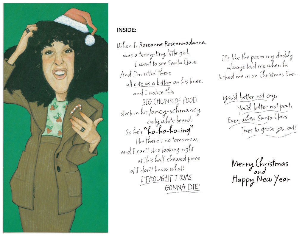 INSIDE: When I, Roseanne Roseanna Danna, was a teeny-tiny little girl, I went to see Santa Claus. And I’m sittin’ there all cute as a button on his knee, and I notice this BIG CHUNK OF FOOD stuck in his fancy-schmancy curly white beard. So he’s “ho-ho-ho-ing” like there’s no tomorrow, and I can’t stop looking at this half-chewed piece of I don’t know what! I THOUGHT I WAS GONNA DIE.