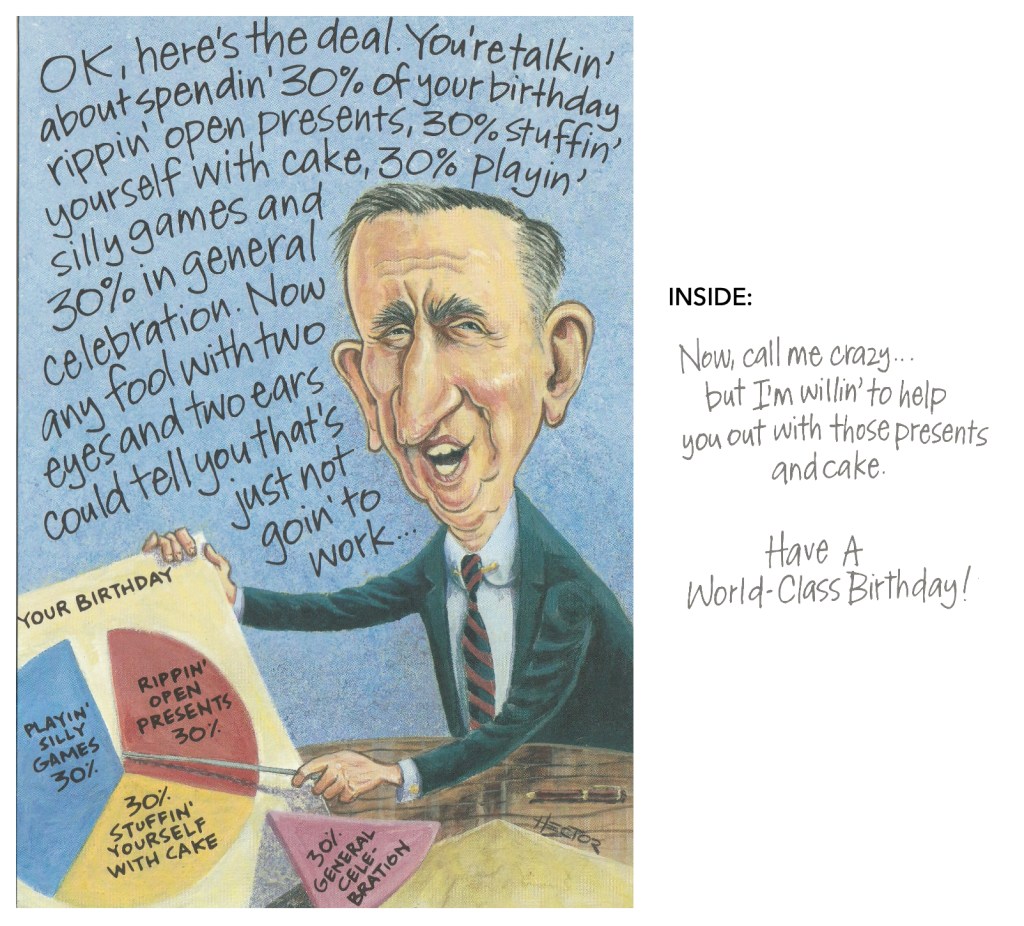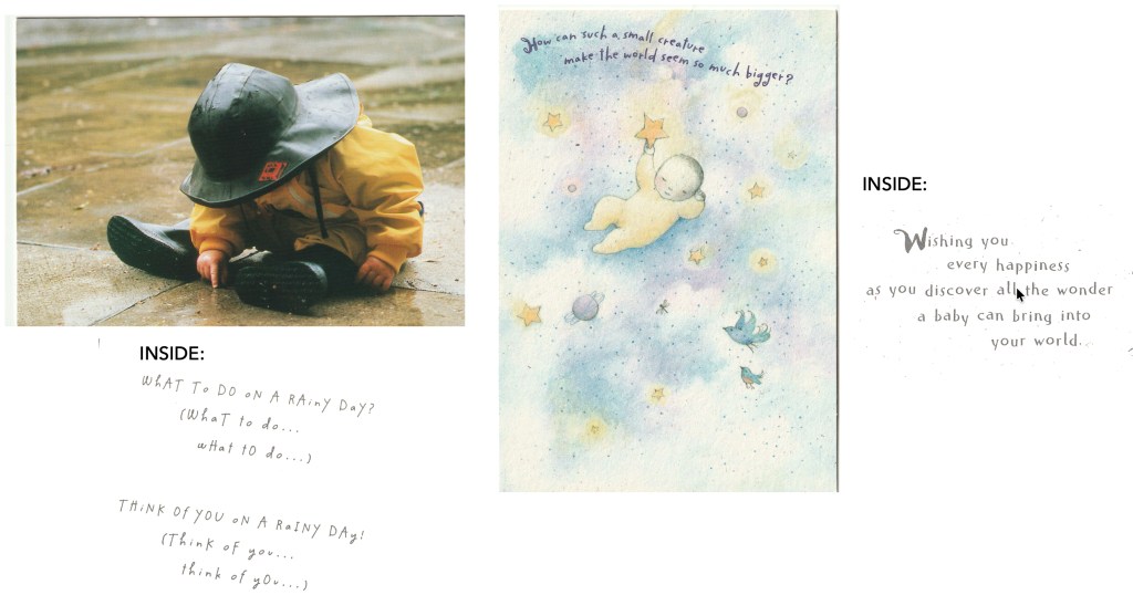 I mostly wrote funny cards, conversational stuff, and structured prose. A sweet elderly gentleman wrote Hallmark to say he liked the one on the left.