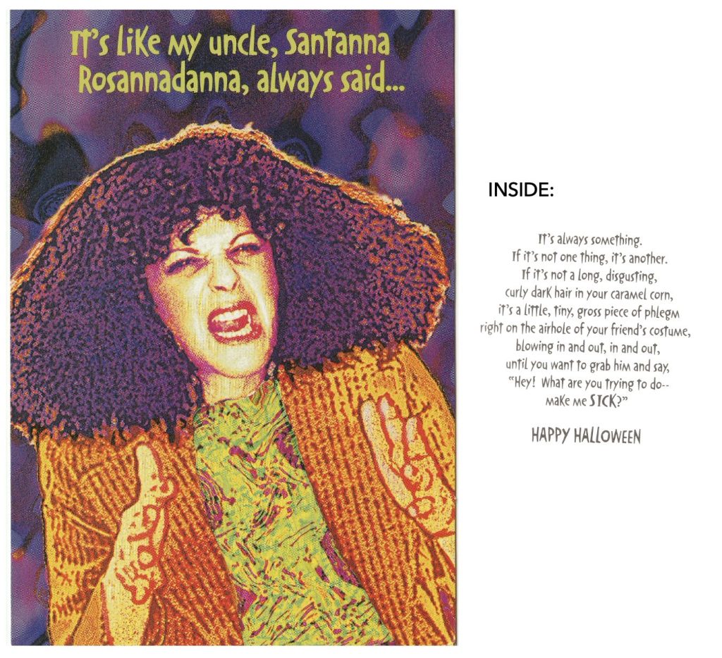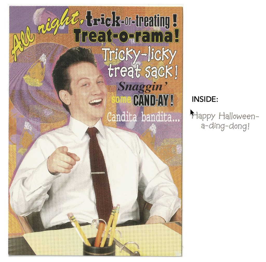INSIDE: It’s always something. If it’s not one thing, it’s another. If it’s not a long, disgusting, curly dark hair in your caramel corn, it’s a little, tiny, gross piece of phlegm right on the airhole of your friend’s costume, blowing in and out, in and out, until you want to grab him and say, “Hey! What are you trying to do—make me SICK?” HAPPY HALLOWEEN