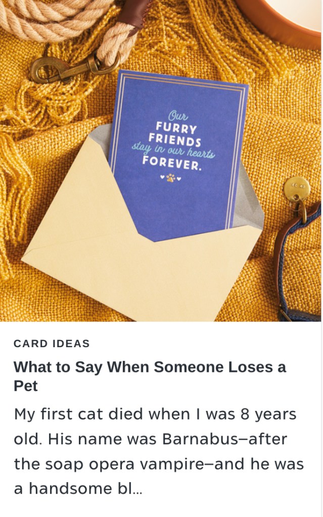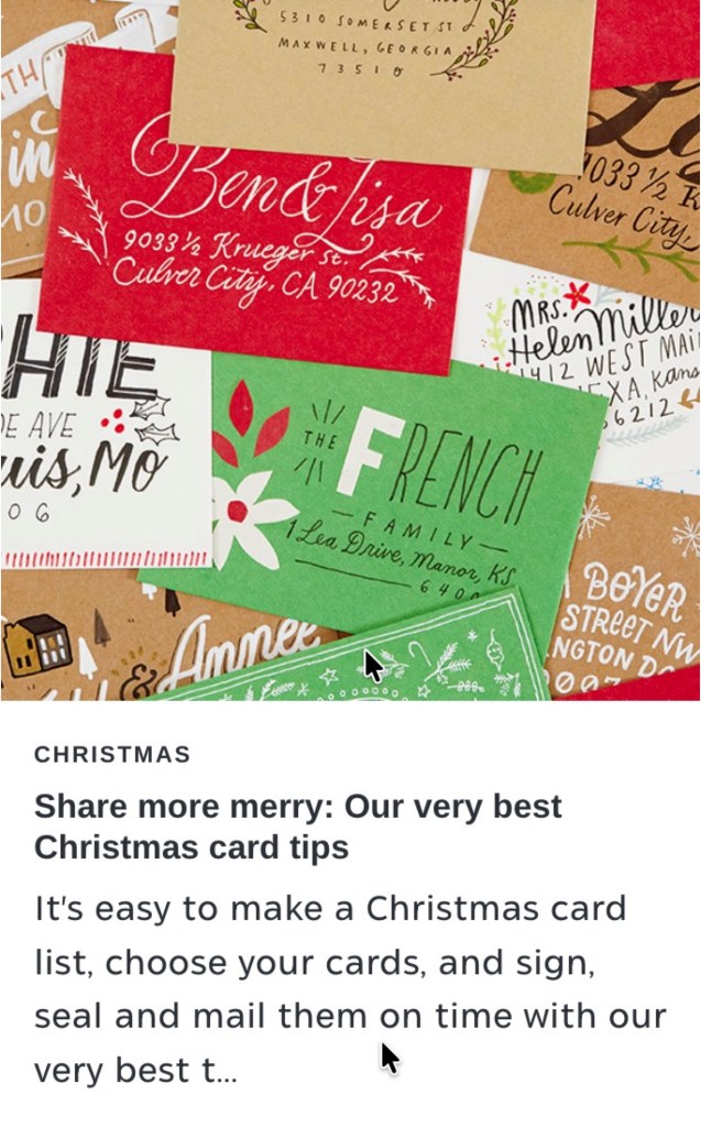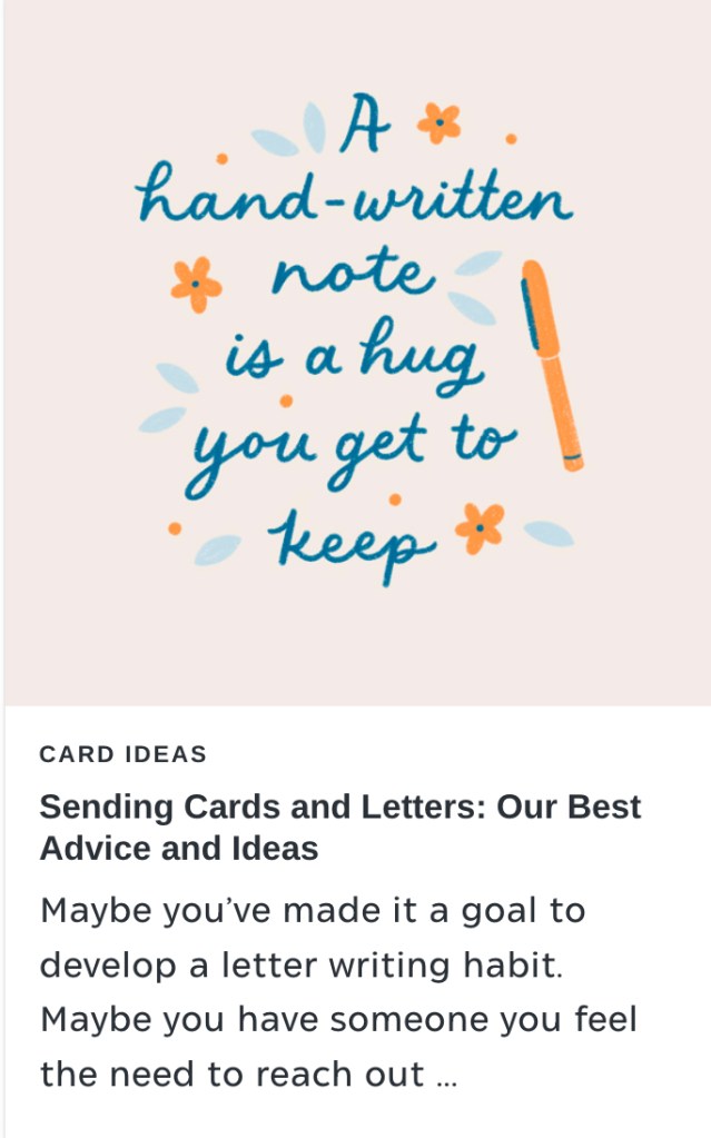 Card writing and sending tips, recipes, etiquette advice, how-tos (in partnership with artists), and other education and service articles.