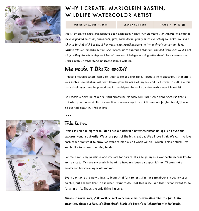 Interview Dutch watercolor artist Marjolein Bastin for content on Hallmark’s creative blog, Think.Make.Share. (NOTE: Blog content is being moved to Ideas.Hallmark.com and is not currently available online.)