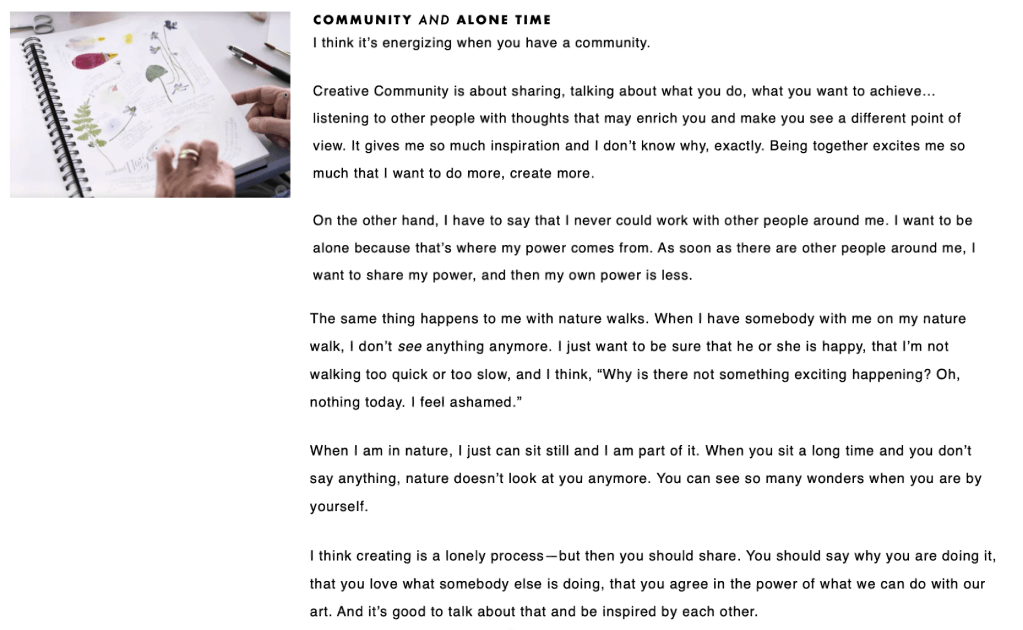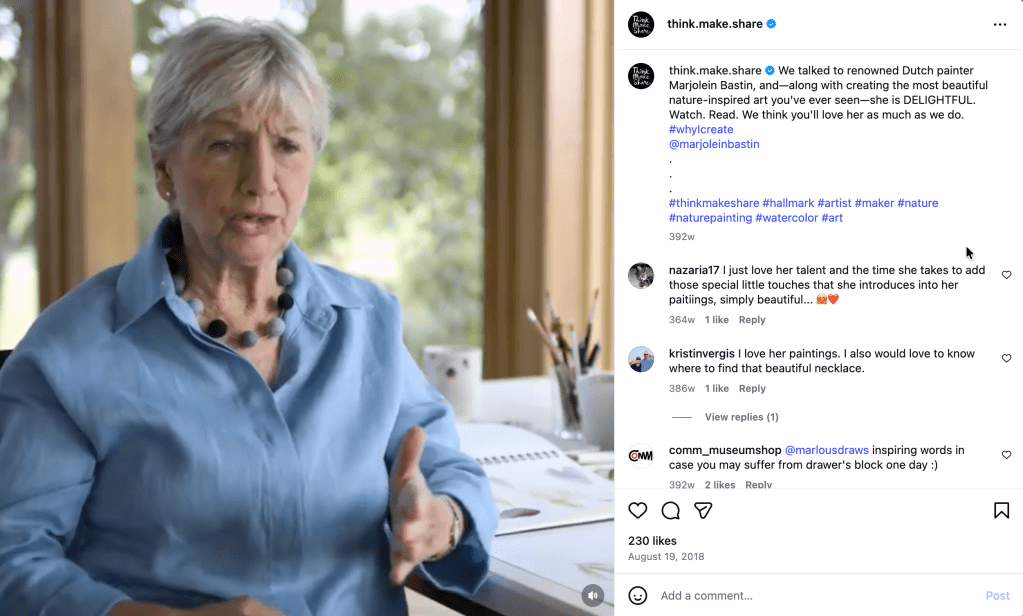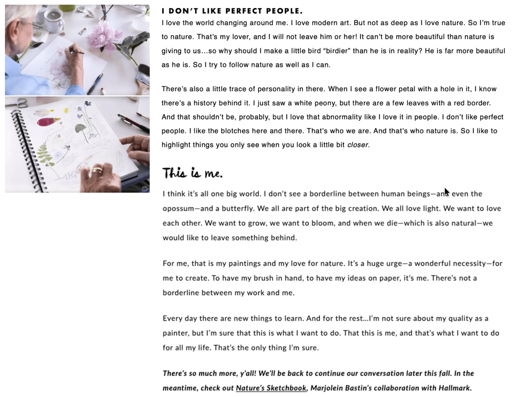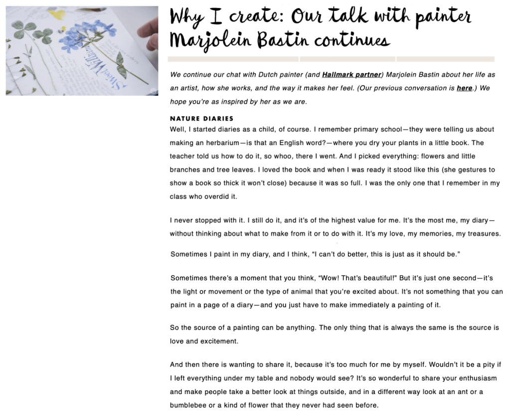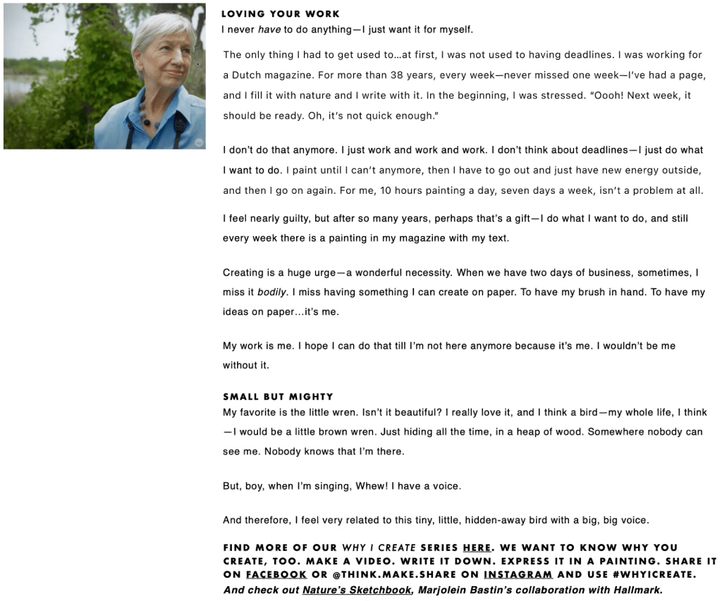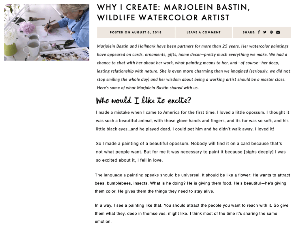 One of Hallmark’s best-selling licenses is the nature-inspired Dutch watercolor artist Marjolein Bastin. To engage to Think. Make. Share. users who weren’t regular Hallmark customers, I focused my interview and articles on her process and perspective as a working artist.
