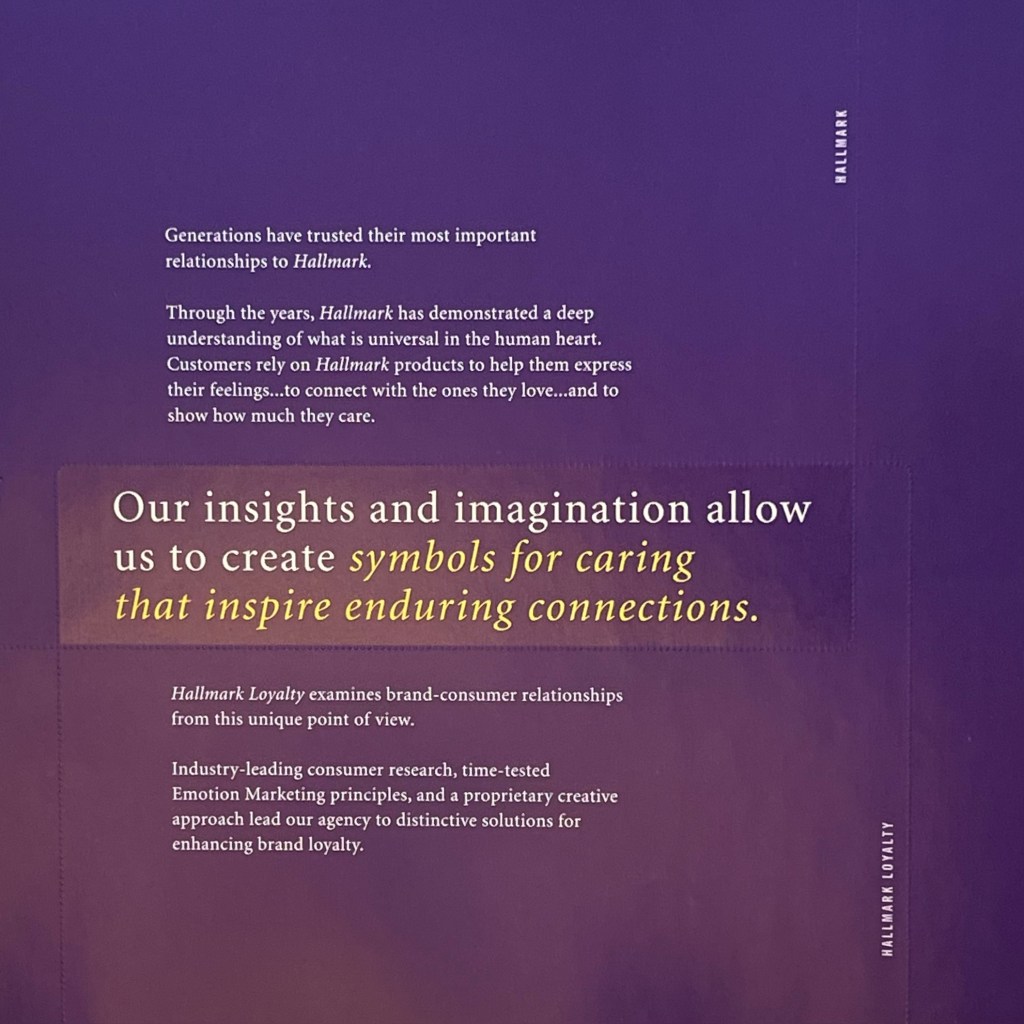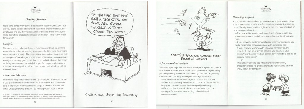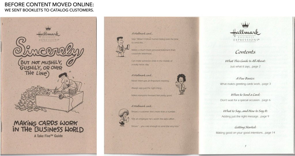 For Hallmark Business Expressions clients who bought cards in bulk to send to clients and customers, we did a little hand-holding. Based on results from an inundation/deprivation study, we learned how businesses could use cards to connect in authentic ways. We put our tips in a little booklet and sent it out with catalogs.