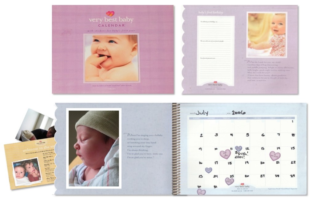 - Baby milestones calendar to personalize with stickers to track milestones, space for notes and photos, and pockets for memorabilia