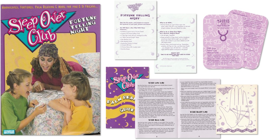 I also co-wrote invitations, recipes, activity instructions, and game ideas for Parker Bros. Sleep Over Club kits like “Fortune Telling Night,” “It’s Me to a T-Shirt Night,” and “Scared to Death” night, which came with a scary story cassette.
